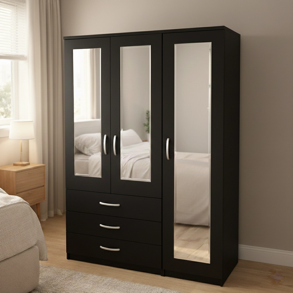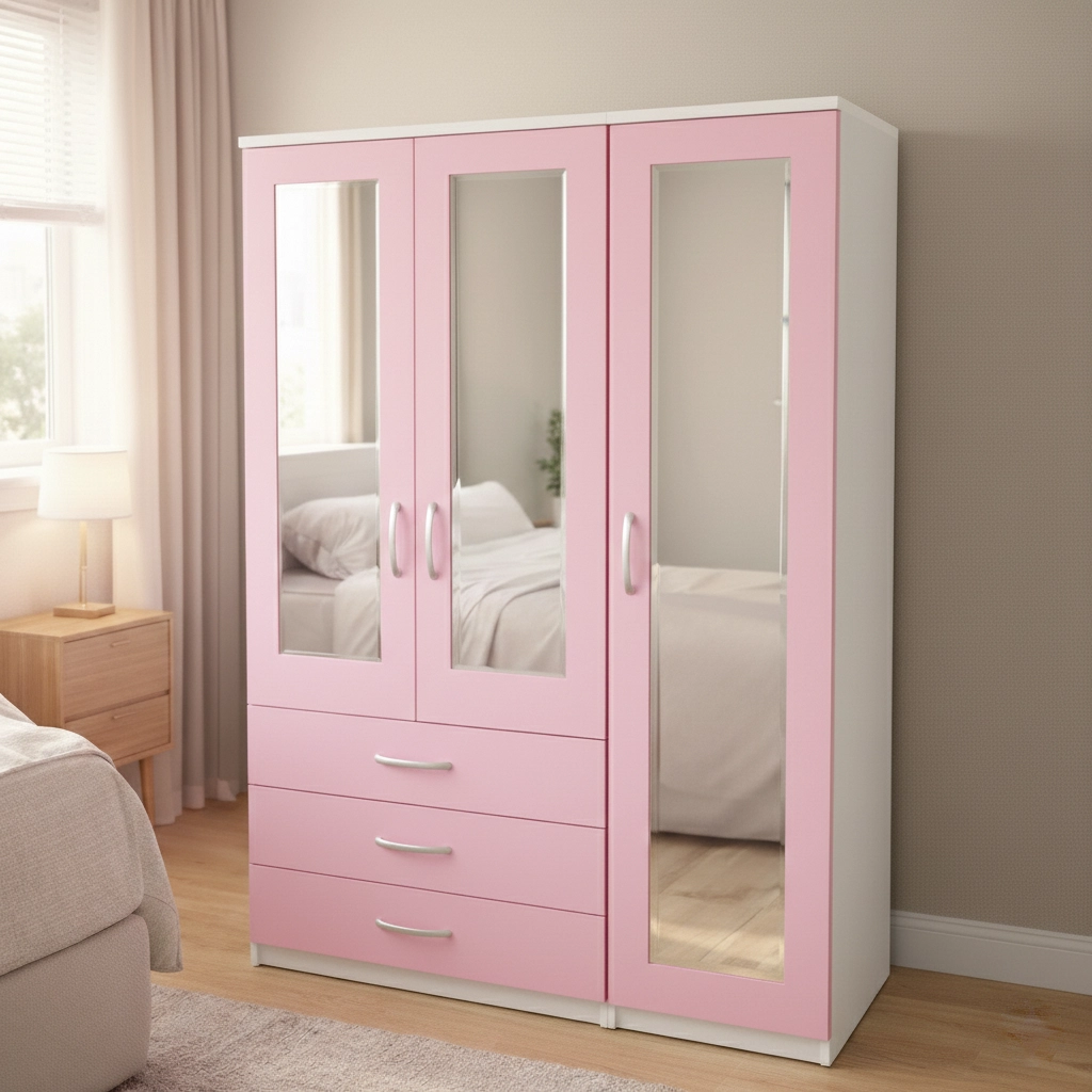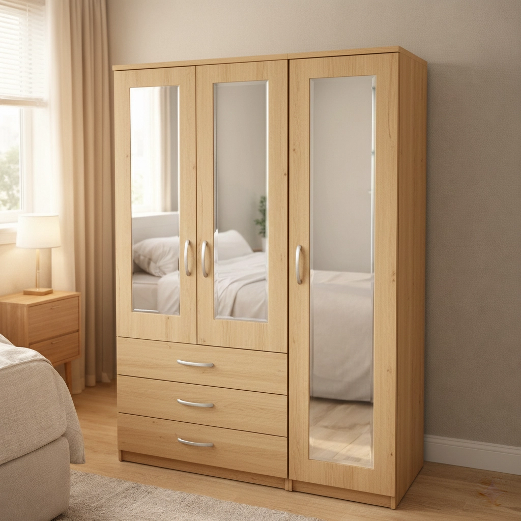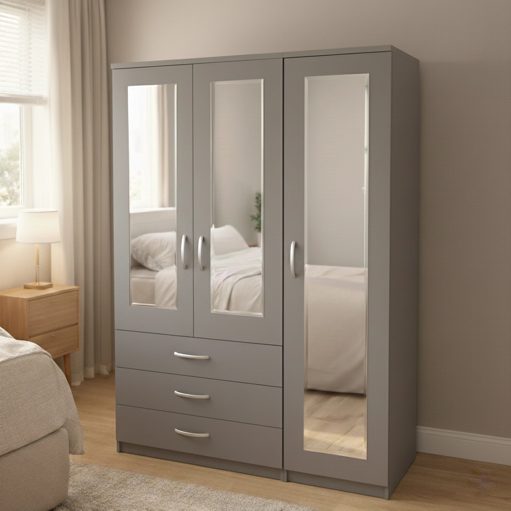 3 Door Mirrored Wardrobe with Drawers is designed to provide generous clothing storage while keeping your bedroom organised and clutter free. This 3 Door Mirrored Wardrobe with Drawers combines wide hanging space, mirror doors, and drawer storage to create a practical furniture solution for everyday use.