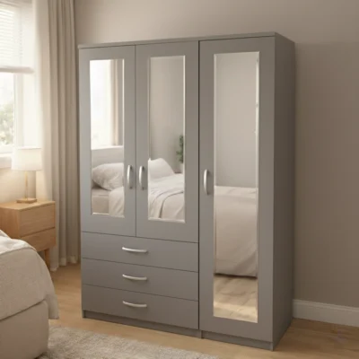 The 3 Door Wardrobe with Mirror features a clean and modern appearance that blends easily with different bedroom interiors. One door includes a full-length mirror that adds both practicality and visual balance to the wardrobe design.